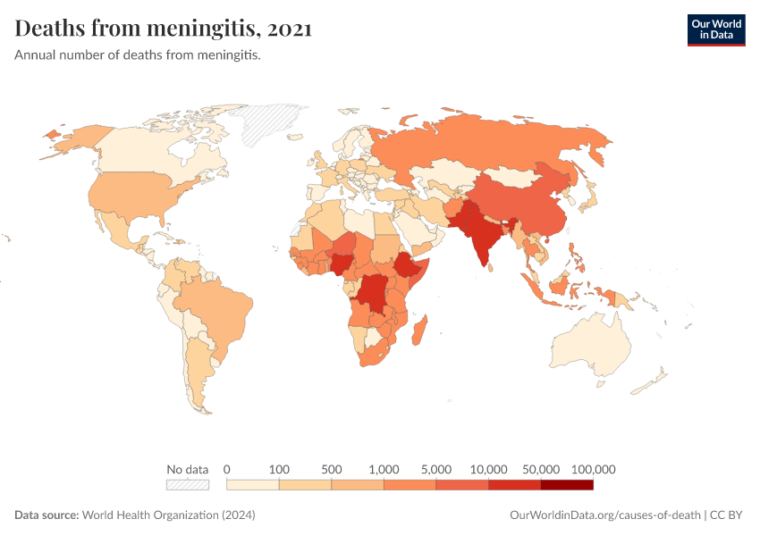 “Data Page: Deaths from meningitis”, part of the following publication: Esteban Ortiz-Ospina and Max Roser (2016) - “Global Health”. Data adapted from World Health Organization. Retrieved from https://region-dods-income-groups.owid.pages.dev/grapher/deaths-from-meningitis-ghe [online resource]How to cite this data