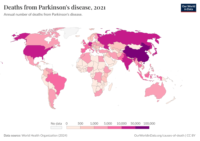 “Data Page: Deaths from Parkinson's disease”, part of the following publication: Esteban Ortiz-Ospina and Max Roser (2016) - “Global Health”. Data adapted from World Health Organization. Retrieved from https://region-dods-income-groups.owid.pages.dev/grapher/deaths-from-parkinsons-disease-ghe [online resource]How to cite this data
