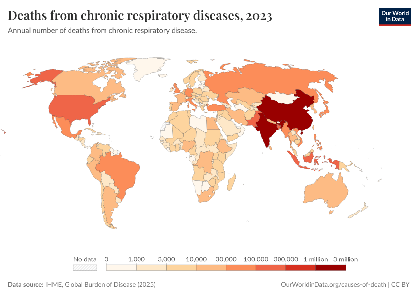 “Data Page: Deaths from chronic respiratory diseases”, part of the following publication: Esteban Ortiz-Ospina and Max Roser (2016) - “Global Health”. Data adapted from IHME, Global Burden of Disease. Retrieved from https://region-dods-income-groups.owid.pages.dev/grapher/deaths-from-respiratory-disease [online resource]How to cite this data