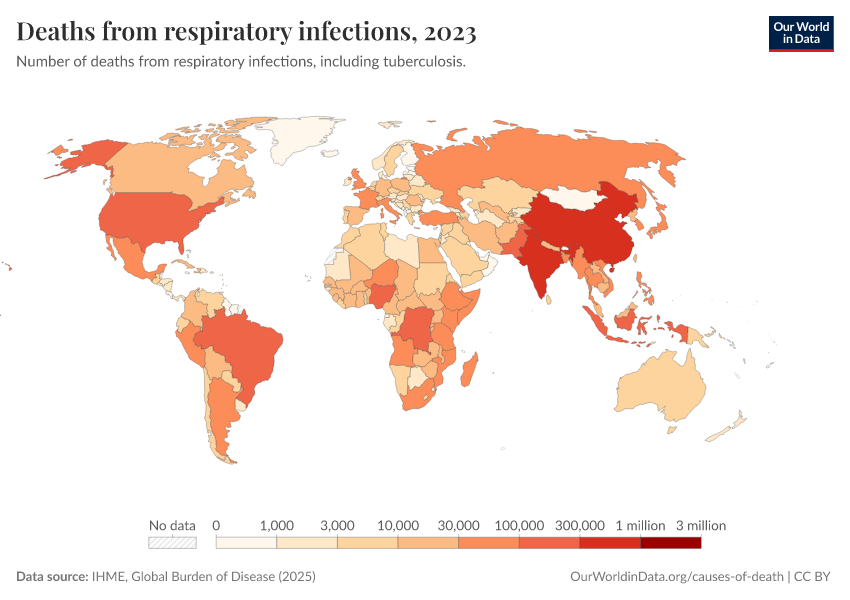 “Data Page: Deaths from respiratory infections”, part of the following publication: Esteban Ortiz-Ospina and Max Roser (2016) - “Global Health”. Data adapted from IHME, Global Burden of Disease. Retrieved from https://region-dods-income-groups.owid.pages.dev/grapher/deaths-from-respiratory-infections [online resource]How to cite this data