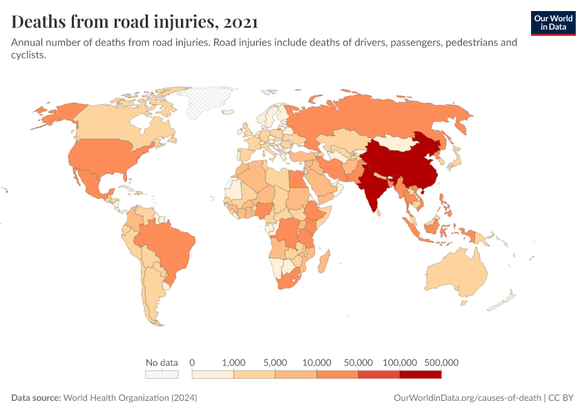 “Data Page: Deaths from road injuries”, part of the following publication: Esteban Ortiz-Ospina and Max Roser (2016) - “Global Health”. Data adapted from World Health Organization. Retrieved from https://region-dods-income-groups.owid.pages.dev/grapher/deaths-from-road-injuries [online resource]How to cite this data
