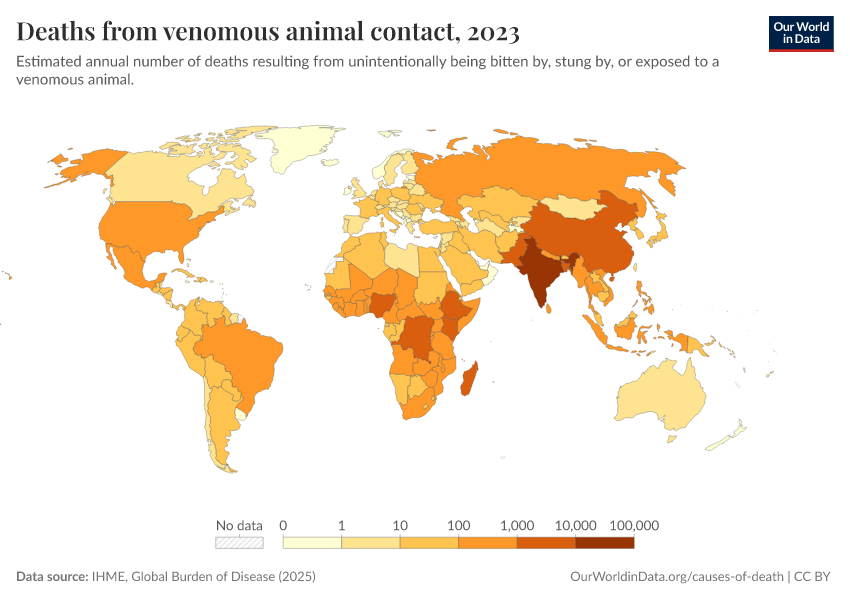 “Data Page: Deaths from venomous animal contact”, part of the following publication: Esteban Ortiz-Ospina and Max Roser (2016) - “Global Health”. Data adapted from IHME, Global Burden of Disease. Retrieved from https://region-dods-income-groups.owid.pages.dev/grapher/deaths-from-venomous-animal-contact [online resource]How to cite this data