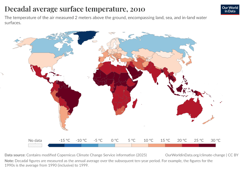 “Data Page: Decadal average surface temperature”, part of the following publication: Hannah Ritchie, Pablo Rosado, and Veronika Samborska (2024) - “Climate Change”. Data adapted from Contains modified Copernicus Climate Change Service information. Retrieved from https://region-dods-income-groups.owid.pages.dev/grapher/decadal-average-surface-temperature [online resource]How to cite this data