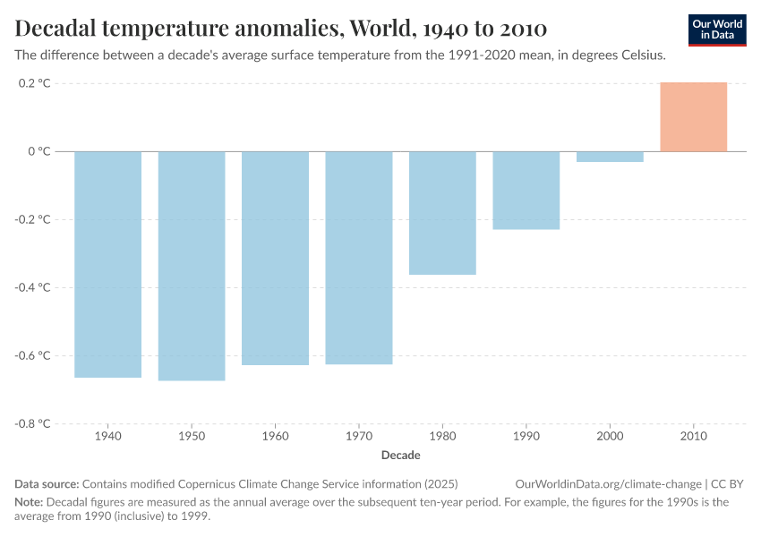 “Data Page: Decadal temperature anomalies”, part of the following publication: Hannah Ritchie, Pablo Rosado, and Veronika Samborska (2024) - “Climate Change”. Data adapted from Contains modified Copernicus Climate Change Service information. Retrieved from https://region-dods-income-groups.owid.pages.dev/grapher/decadal-temperature-anomaly [online resource]
