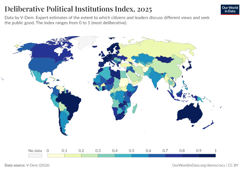 “Data Page: Deliberative political institutions index”, part of the following publication: Bastian Herre, Lucas Rodés-Guirao, and Esteban Ortiz-Ospina (2013) - “Democracy”. Data adapted from V-Dem. Retrieved from https://region-dods-income-groups.owid.pages.dev/grapher/deliberative-political-institutions-index [online resource]How to cite this data