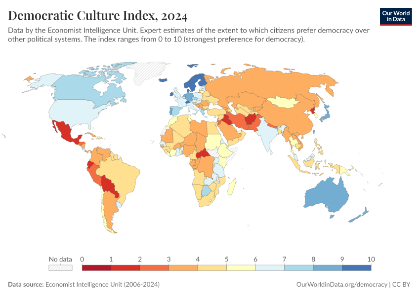 “Data Page: Democratic Culture Index”, part of the following publication: Bastian Herre, Lucas Rodés-Guirao, and Esteban Ortiz-Ospina (2013) - “Democracy”. Data adapted from Economist Intelligence Unit, Gapminder, Various sources. Retrieved from https://region-dods-income-groups.owid.pages.dev/grapher/democratic-culture-index-eiu [online resource]How to cite this data