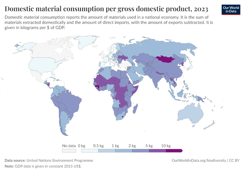 “Data Page: Domestic material consumption per gross domestic product”. Our World in Data (2026). Data adapted from United Nations Environment Programme. Retrieved from https://region-dods-income-groups.owid.pages.dev/grapher/domestic-material-consumption-per-unit-of-gdp [online resource]How to cite this data
