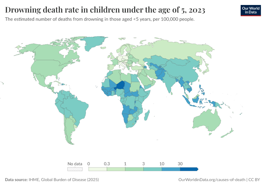 “Data Page: Drowning death rate in children under the age of 5”, part of the following publication: Esteban Ortiz-Ospina and Max Roser (2016) - “Global Health”. Data adapted from IHME, Global Burden of Disease. Retrieved from https://region-dods-income-groups.owid.pages.dev/grapher/drowning-death-rates-under-5 [online resource]How to cite this data