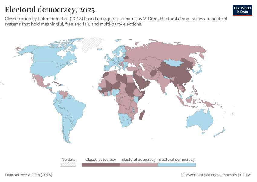 “Data Page: Political regime”, part of the following publication: Bastian Herre, Lucas Rodés-Guirao, and Esteban Ortiz-Ospina (2013) - “Democracy”. Data adapted from V-Dem. Retrieved from https://region-dods-income-groups.owid.pages.dev/grapher/electoral-democracy-row [online resource]How to cite this data