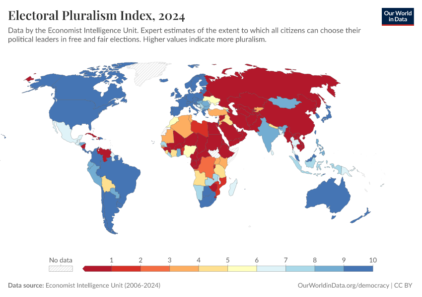 “Data Page: Electoral Pluralism Index”, part of the following publication: Bastian Herre, Lucas Rodés-Guirao, and Esteban Ortiz-Ospina (2013) - “Democracy”. Data adapted from Economist Intelligence Unit, Gapminder, Various sources. Retrieved from https://region-dods-income-groups.owid.pages.dev/grapher/electoral-pluralism-index-eiu [online resource]How to cite this data