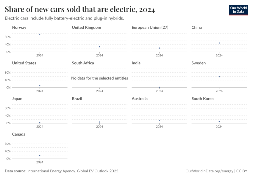 “Data Page: Share of new cars sold that are electric”. Our World in Data (2026). Data adapted from International Energy Agency. Global EV Outlook 2025.. Retrieved from https://region-dods-income-groups.owid.pages.dev/grapher/electric-car-sales-share [online resource]How to cite this data