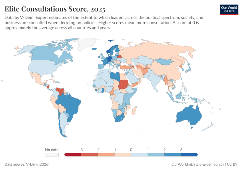 “Data Page: Elite consultation”, part of the following publication: Bastian Herre, Lucas Rodés-Guirao, and Esteban Ortiz-Ospina (2013) - “Democracy”. Data adapted from V-Dem. Retrieved from https://region-dods-income-groups.owid.pages.dev/grapher/elite-consultations-score [online resource]How to cite this data