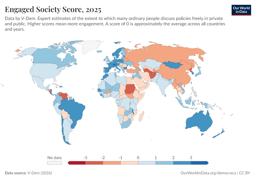 “Data Page: Engaged society”, part of the following publication: Bastian Herre, Lucas Rodés-Guirao, and Esteban Ortiz-Ospina (2013) - “Democracy”. Data adapted from V-Dem. Retrieved from https://region-dods-income-groups.owid.pages.dev/grapher/engaged-society-score [online resource]How to cite this data