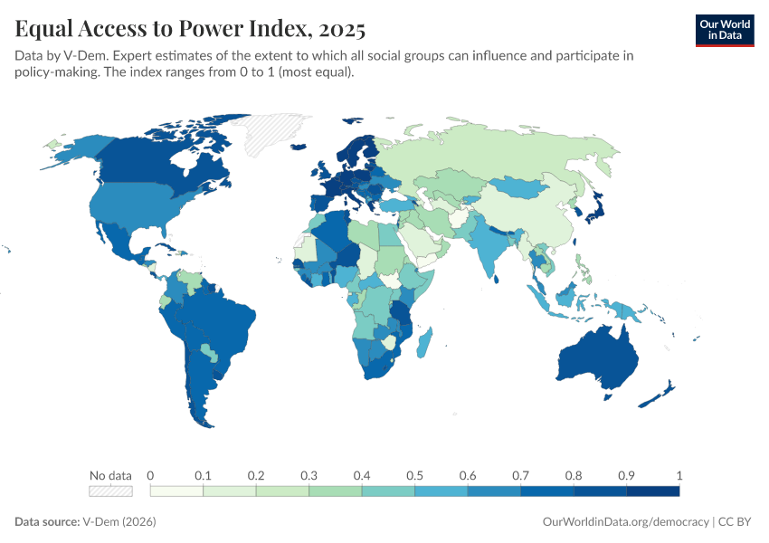 “Data Page: Equal access to power index”, part of the following publication: Bastian Herre, Lucas Rodés-Guirao, and Esteban Ortiz-Ospina (2013) - “Democracy”. Data adapted from V-Dem. Retrieved from https://region-dods-income-groups.owid.pages.dev/grapher/equal-access-to-power-index [online resource]How to cite this data