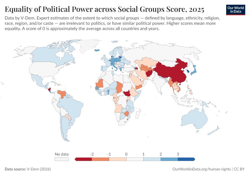 “Data Page: Equality of political power across social groups”, part of the following publication: Bastian Herre, Lucas Rodés-Guirao, and Esteban Ortiz-Ospina (2013) - “Democracy”. Data adapted from V-Dem. Retrieved from https://region-dods-income-groups.owid.pages.dev/grapher/equality-of-political-power-across-social-groups-score [online resource]How to cite this data