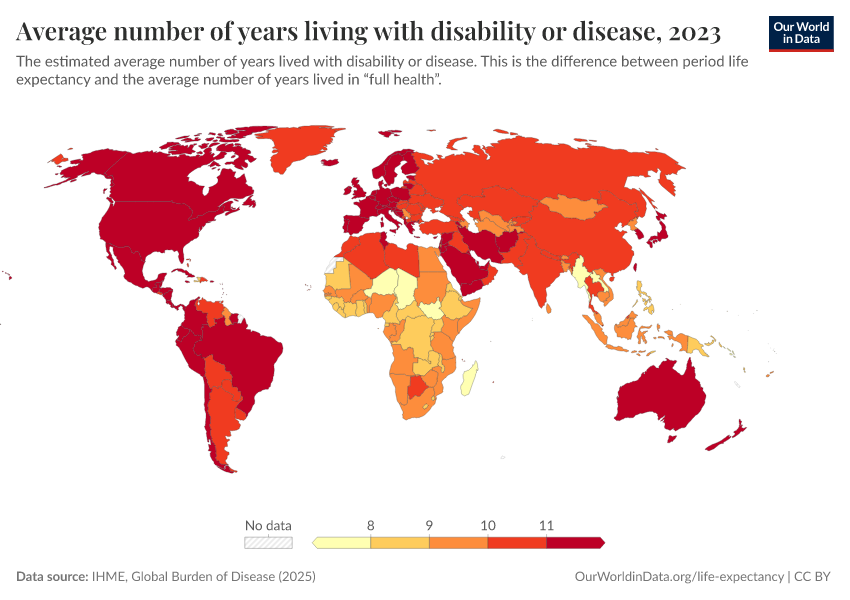 “Data Page: Average number of years living with disability or disease”, part of the following publication: Saloni Dattani, Lucas Rodés-Guirao, Hannah Ritchie, Esteban Ortiz-Ospina, and Max Roser (2023) - “Life Expectancy”. Data adapted from IHME, Global Burden of Disease. Retrieved from https://region-dods-income-groups.owid.pages.dev/grapher/expected-years-of-living-with-disability-or-disease-burden [online resource]How to cite this data