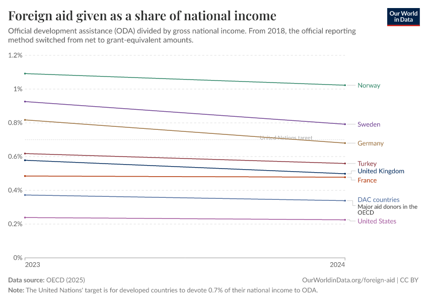 “Data Page: Foreign aid given as a share of national income”, part of the following publication: Bastian Herre, Pablo Arriagada, Simon van Teutem, and Hannah Ritchie (2024) - “Foreign Aid”. Data adapted from OECD. Retrieved from https://region-dods-income-groups.owid.pages.dev/grapher/foreign-aid-given-as-a-share-of-national-income [online resource]