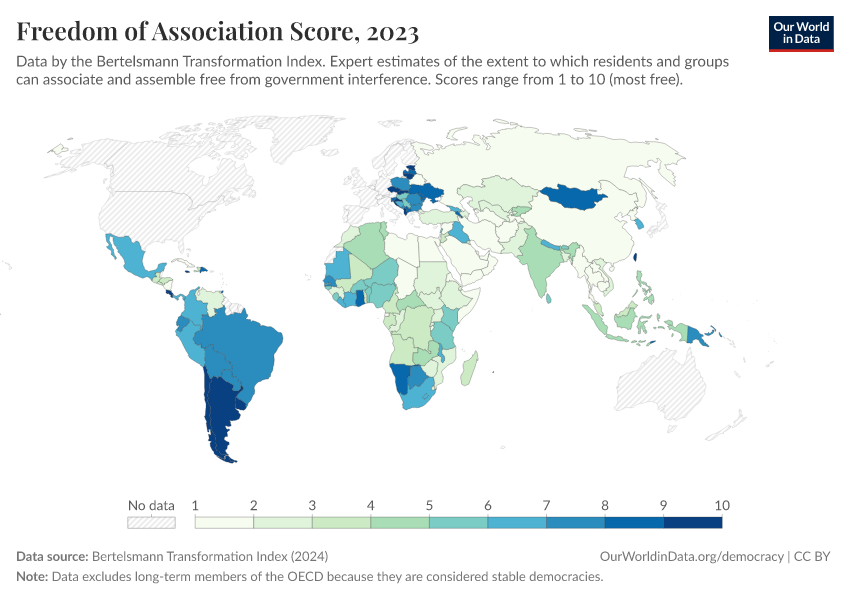 “Data Page: Freedom of Association Score”, part of the following publication: Bastian Herre, Lucas Rodés-Guirao, and Esteban Ortiz-Ospina (2013) - “Democracy”. Data adapted from Bertelsmann Transformation Index. Retrieved from https://region-dods-income-groups.owid.pages.dev/grapher/freedom-of-association-score-bti [online resource]How to cite this data