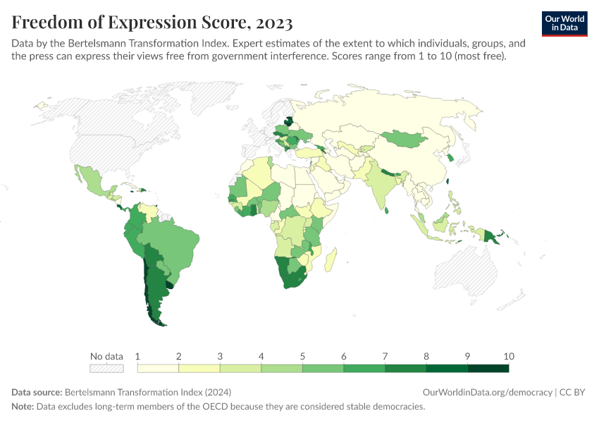 “Data Page: Freedom of Expression Score”, part of the following publication: Bastian Herre, Lucas Rodés-Guirao, and Esteban Ortiz-Ospina (2013) - “Democracy”. Data adapted from Bertelsmann Transformation Index. Retrieved from https://region-dods-income-groups.owid.pages.dev/grapher/freedom-of-expression-score-bti [online resource]How to cite this data