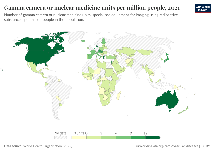 “Data Page: Gamma camera or nuclear medicine units per million people”, part of the following publication: Saloni Dattani, Veronika Samborska, Hannah Ritchie, and Max Roser (2023) - “Cardiovascular Diseases”. Data adapted from World Health Organisation. Retrieved from https://region-dods-income-groups.owid.pages.dev/grapher/gamma-camera-or-nuclear-medicine-availability [online resource]How to cite this data