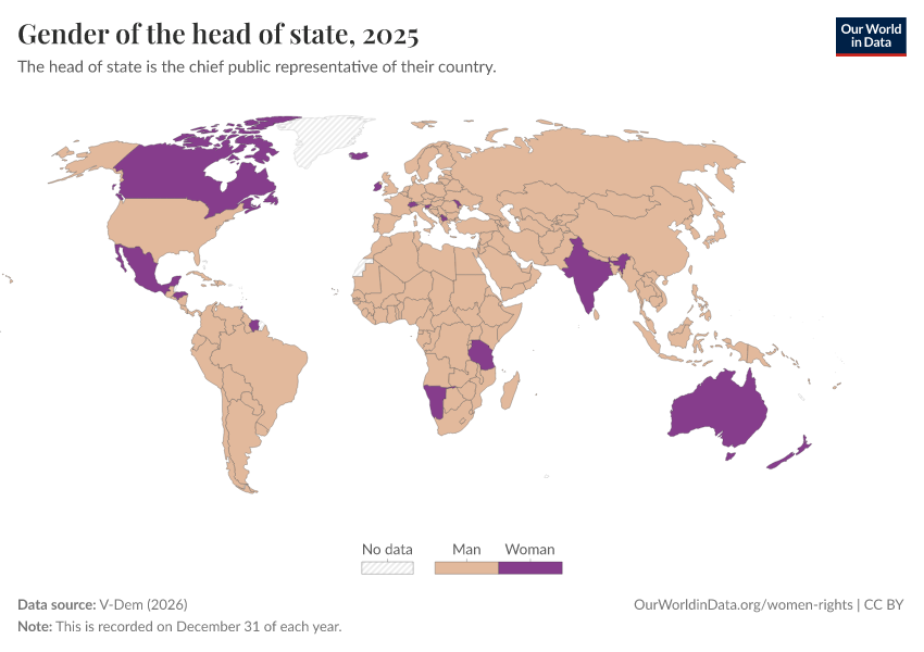 V-Dem (2025) – processed by Our World in Data. “Gender of the head of state” [dataset]. V-Dem, “Democracy report v15” [original data]. Retrieved February 26, 2026 from https://region-dods-income-groups.owid.pages.dev/grapher/gender-of-the-head-of-state
