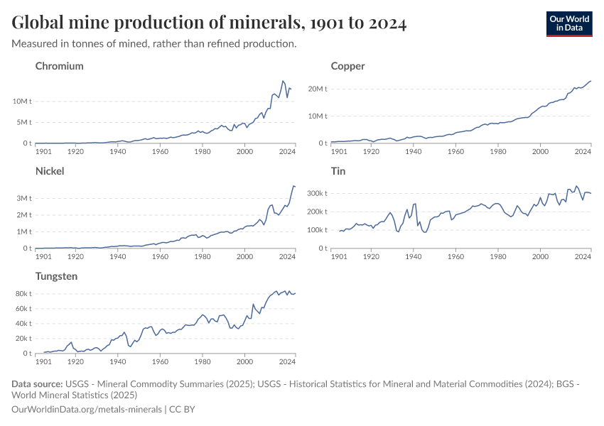 USGS - Mineral Commodity Summaries (2025); USGS - Historical Statistics for Mineral and Material Commodities (2024); BGS - World Mineral Statistics (2025) – with major processing by Our World in Data. “Global mine production of minerals” [dataset]. United States Geological Survey, “Mineral Commodity Summaries”; United States Geological Survey, “Historical Statistics for Mineral and Material Commodities”; British Geological Survey, “World Mineral Statistics” [original data]. Retrieved February 26, 2026 from https://region-dods-income-groups.owid.pages.dev/grapher/global-mine-production-minerals