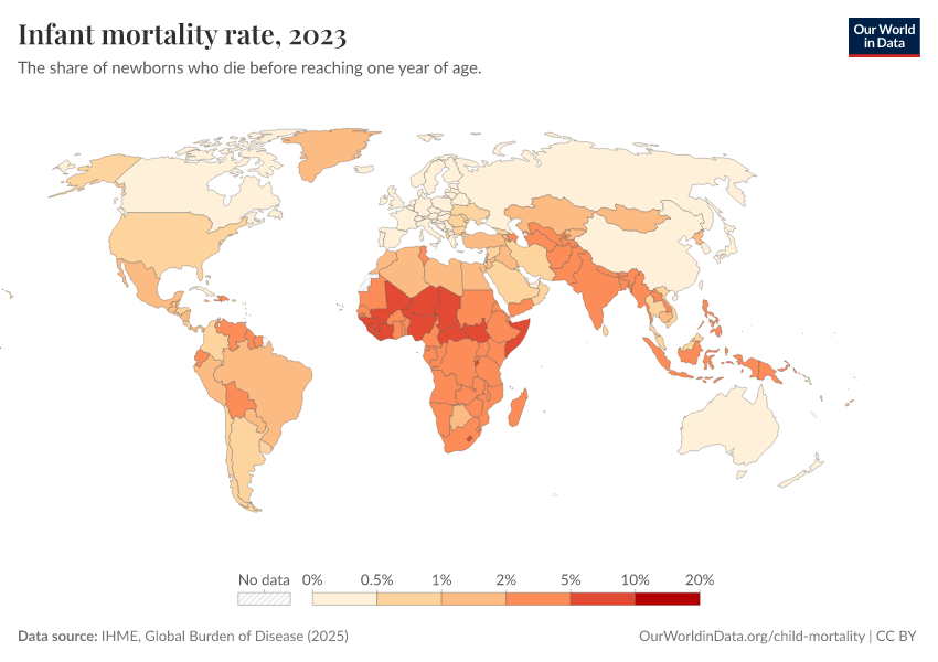 IHME, Global Burden of Disease (2025) – with minor processing by Our World in Data. “Infant mortality rate” [dataset]. IHME, Global Burden of Disease, “Global Burden of Disease - Child Mortality” [original data]. Retrieved February 26, 2026 from https://region-dods-income-groups.owid.pages.dev/grapher/infant-mortality-rate
