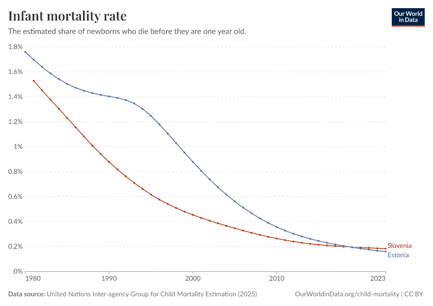 United Nations Inter-agency Group for Child Mortality Estimation (2025) – with minor processing by Our World in Data. “Infant mortality rate” [dataset]. United Nations Inter-agency Group for Child Mortality Estimation, “United Nations Inter-agency Group for Child Mortality Estimation”; Various sources, “Population” [original data]. Retrieved February 26, 2026 from https://region-dods-income-groups.owid.pages.dev/grapher/infant-mortality