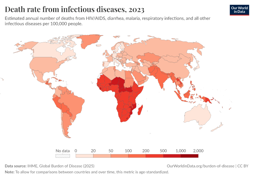“Data Page: Death rate from infectious diseases”, part of the following publication: Esteban Ortiz-Ospina and Max Roser (2016) - “Global Health”. Data adapted from IHME, Global Burden of Disease. Retrieved from https://region-dods-income-groups.owid.pages.dev/grapher/infectious-disease-death-rates [online resource]How to cite this data