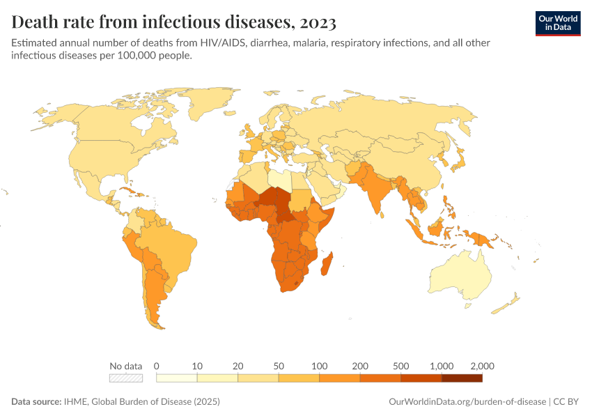 “Data Page: Death rate from infectious diseases”, part of the following publication: Esteban Ortiz-Ospina and Max Roser (2016) - “Global Health”. Data adapted from IHME, Global Burden of Disease. Retrieved from https://region-dods-income-groups.owid.pages.dev/grapher/infectious-disease-death-rates-gbd [online resource]How to cite this data