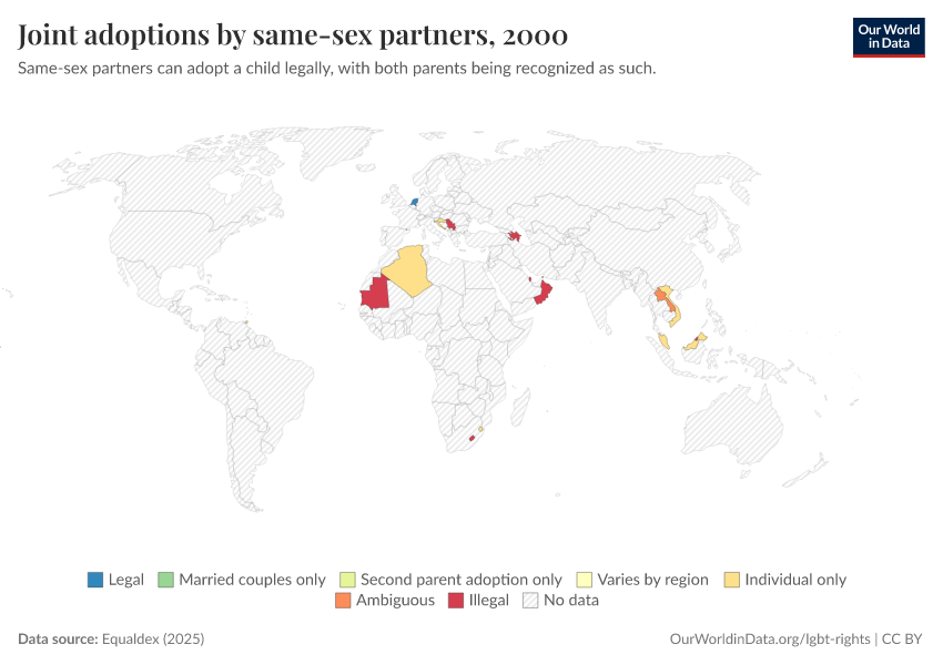 “Data Page: Joint adoptions by same-sex partners”, part of the following publication: Bastian Herre and Pablo Arriagada (2023) - “LGBT+ Rights”. Data adapted from Equaldex. Retrieved from https://region-dods-income-groups.owid.pages.dev/grapher/joint-adoptions-same-sex-partners-equaldex [online resource]