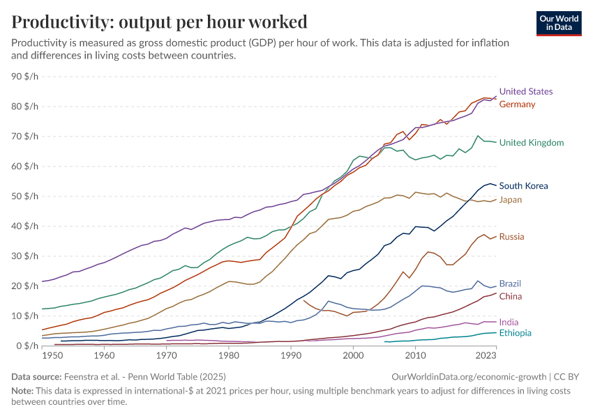 “Data Page: Productivity: output per hour worked”, part of the following publication: Max Roser, Bertha Rohenkohl, Pablo Arriagada, Joe Hasell, Hannah Ritchie, and Esteban Ortiz-Ospina (2023) - “Economic Growth”. Data adapted from Feenstra et al.. Retrieved from https://region-dods-income-groups.owid.pages.dev/grapher/labor-productivity-per-hour-pennworldtable [online resource]How to cite this data