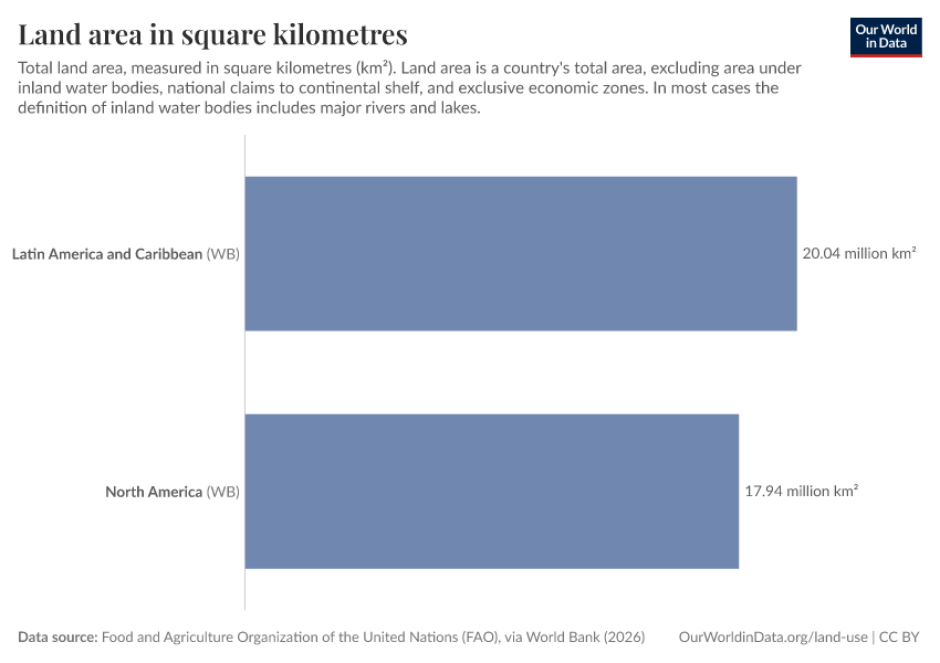 Food and Agriculture Organization of the United Nations (FAO), via World Bank (2026) – processed by Our World in Data. “Land area in square kilometres” [dataset]. Food and Agriculture Organization of the United Nations (FAO), via World Bank, “World Development Indicators 125” [original data]. Retrieved February 26, 2026 from https://region-dods-income-groups.owid.pages.dev/grapher/land-area-km