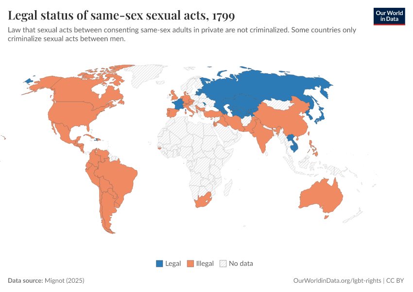 “Data Page: Legal status of same-sex sexual acts”, part of the following publication: Bastian Herre and Pablo Arriagada (2023) - “LGBT+ Rights”. Data adapted from Mignot. Retrieved from https://region-dods-income-groups.owid.pages.dev/grapher/legal-status-of-same-sex-sexual-acts [online resource]