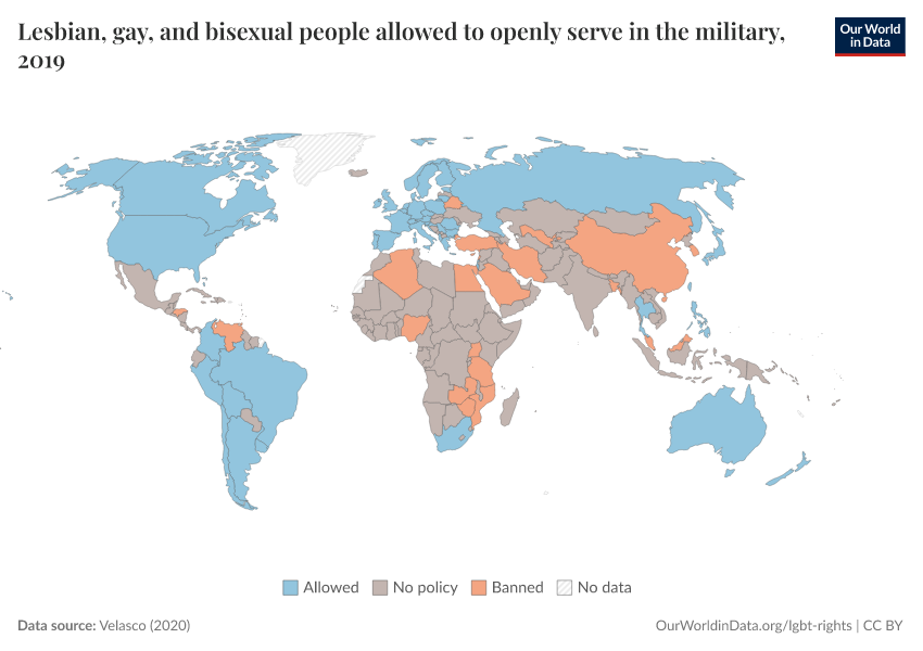 “Data Page: Lesbian, gay, and bisexual people allowed to openly serve in the military”, part of the following publication: Bastian Herre and Pablo Arriagada (2023) - “LGBT+ Rights”. Data adapted from Velasco. Retrieved from https://region-dods-income-groups.owid.pages.dev/grapher/lgb-military-velasco [online resource]How to cite this data