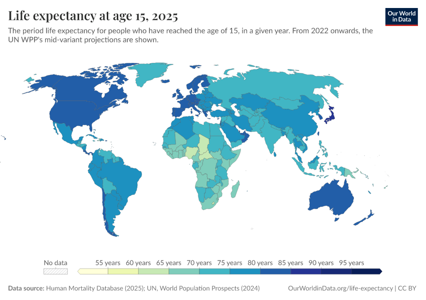 “Data Page: Life expectancy at 15”, part of the following publication: Saloni Dattani, Lucas Rodés-Guirao, Hannah Ritchie, Esteban Ortiz-Ospina, and Max Roser (2023) - “Life Expectancy”. Data adapted from Human Mortality Database, United Nations. Retrieved from https://region-dods-income-groups.owid.pages.dev/grapher/life-expectancy-at-age-15 [online resource]How to cite this data
