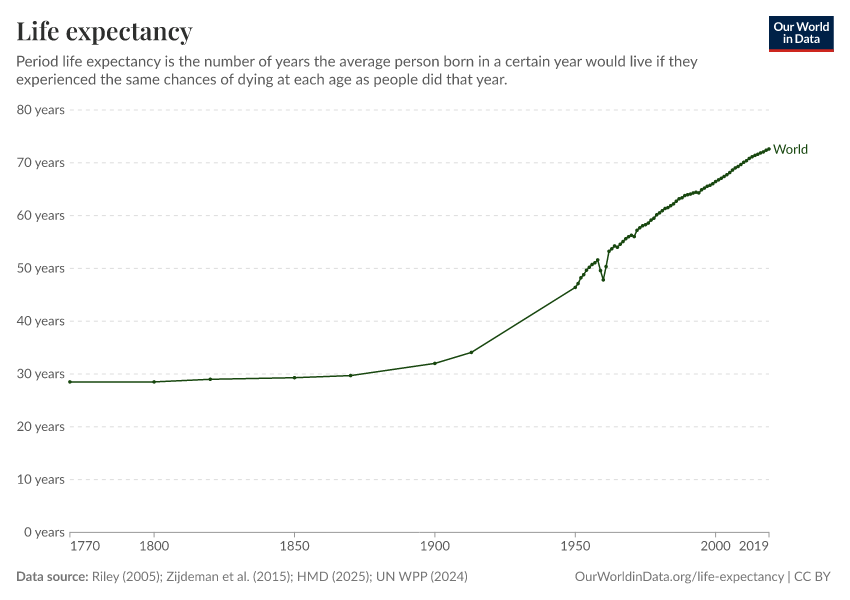 - This chart shows long-run estimates of life expectancy compiled by our team from several data sources. Before 1950, for country-level data, we rely on the Human Mortality Database (2025) combined with Zijdeman (2015). For regional data, we use Riley (2005). From 1950 onward, we use the United Nations World Population Prospects (2024).