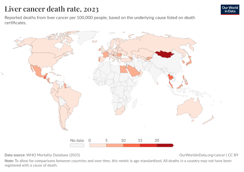 “Data Page: Liver cancer death rate”, part of the following publication: Saloni Dattani, Fiona Spooner, Hannah Ritchie, and Max Roser (2023) - “Causes of Death”. Data adapted from WHO Mortality Database. Retrieved from https://region-dods-income-groups.owid.pages.dev/grapher/liver-cancer-death-rate [online resource]How to cite this data