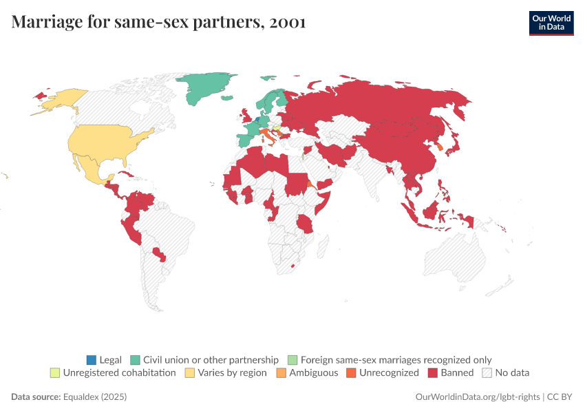 “Data Page: Marriage for same-sex partners”, part of the following publication: Bastian Herre and Pablo Arriagada (2023) - “LGBT+ Rights”. Data adapted from Equaldex. Retrieved from https://region-dods-income-groups.owid.pages.dev/grapher/marriage-same-sex-partners-equaldex [online resource]How to cite this data