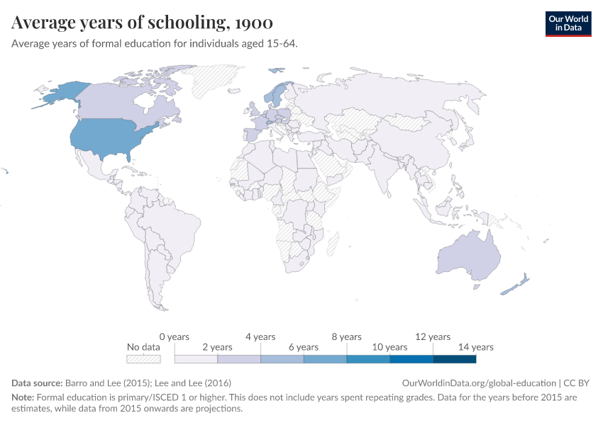 “Data Page: Average years of schooling”, part of the following publication: Hannah Ritchie, Veronika Samborska, Esteban Ortiz-Ospina, and Max Roser (2023) - “Global Education”. Data adapted from Barro and Lee, Lee and Lee. Retrieved from https://region-dods-income-groups.owid.pages.dev/grapher/mean-years-of-schooling-long-run [online resource]