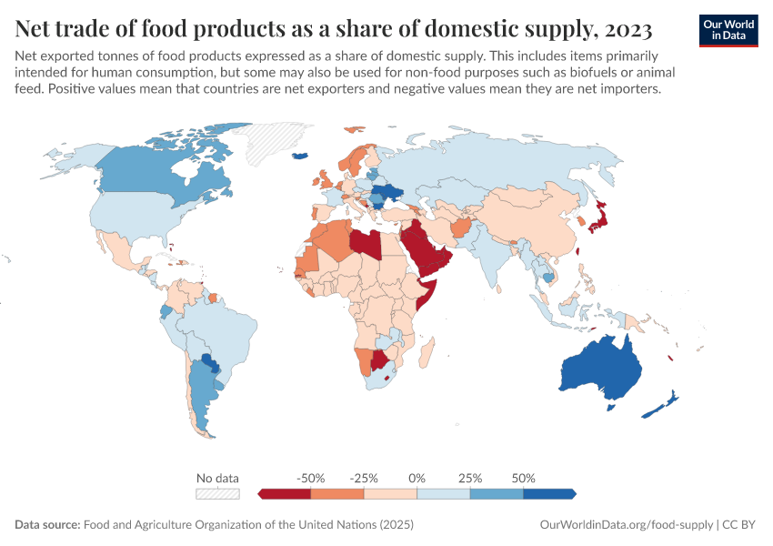 “Data Page: Net trade of food products as a share of domestic supply”, part of the following publication: Hannah Ritchie, Pablo Rosado, and Max Roser (2023) - “Agricultural Production”. Data adapted from Food and Agriculture Organization of the United Nations. Retrieved from https://region-dods-income-groups.owid.pages.dev/grapher/net-food-trade-as-a-share-of-domestic-supply [online resource]How to cite this data