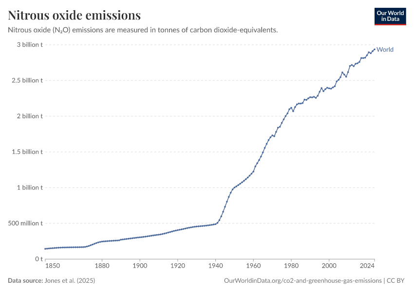 Jones et al. (2025) – with major processing by Our World in Data. “Annual nitrous oxide emissions including land use” [dataset]. Jones et al., “National contributions to climate change 2025.1” [original data]. Retrieved February 26, 2026 from https://region-dods-income-groups.owid.pages.dev/grapher/nitrous-oxide-emissions