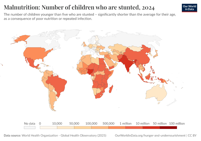 “Data Page: Malnutrition: Number of children who are stunted”. Our World in Data (2026). Data adapted from World Health Organization. Retrieved from https://region-dods-income-groups.owid.pages.dev/grapher/number-children-stunted-who [online resource]How to cite this data