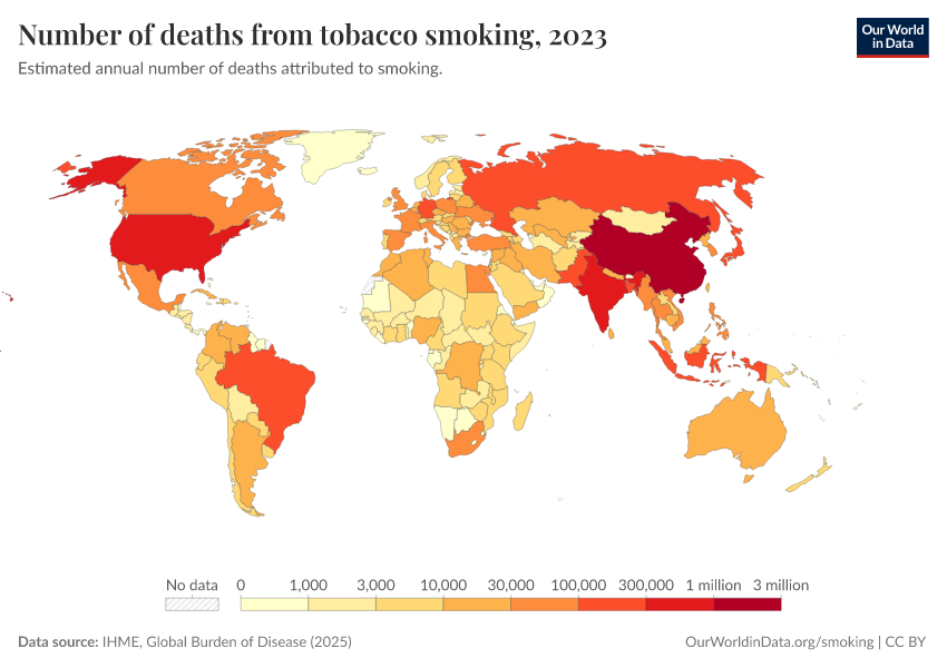 “Data Page: Number of deaths from tobacco smoking”, part of the following publication: Esteban Ortiz-Ospina and Max Roser (2016) - “Global Health”. Data adapted from IHME, Global Burden of Disease. Retrieved from https://region-dods-income-groups.owid.pages.dev/grapher/number-of-deaths-from-tobacco-smoking [online resource]How to cite this data
