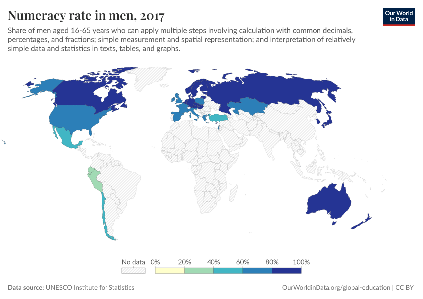 “Data Page: Numeracy rate in men”. Our World in Data (2026). Data adapted from UNESCO Institute for Statistics. Retrieved from https://region-dods-income-groups.owid.pages.dev/grapher/numeracy-rate-in-adult-men [online resource]How to cite this data