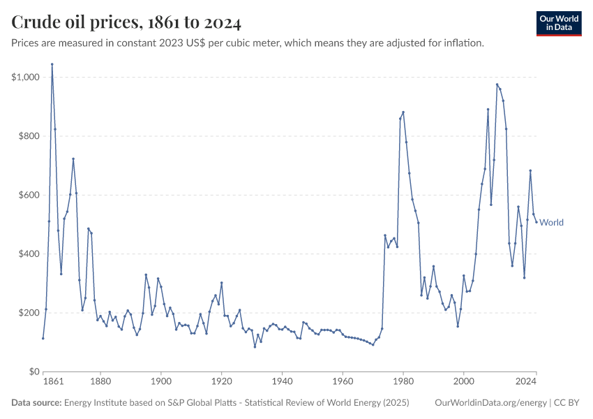 “Data Page: Oil price - Crude prices since 1861”, part of the following publication: Hannah Ritchie, Pablo Rosado, and Max Roser (2023) - “Energy”. Data adapted from Energy Institute. Retrieved from https://region-dods-income-groups.owid.pages.dev/grapher/oil-prices-inflation-adjusted [online resource]How to cite this data
