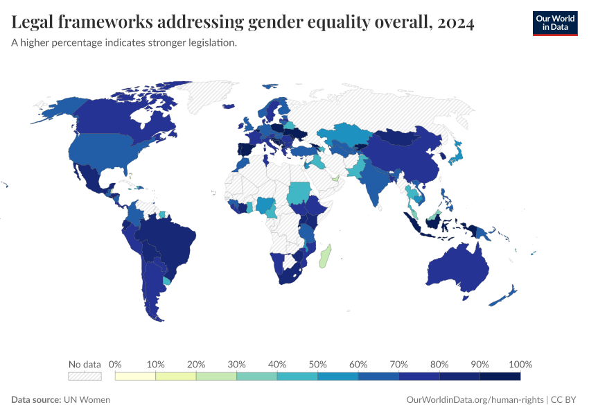 “Data Page: Legal frameworks addressing gender equality overall”. Our World in Data (2026). Data adapted from UN Women. Retrieved from https://region-dods-income-groups.owid.pages.dev/grapher/overarching-legal-frameworks-regarding-gender-equality [online resource]How to cite this data