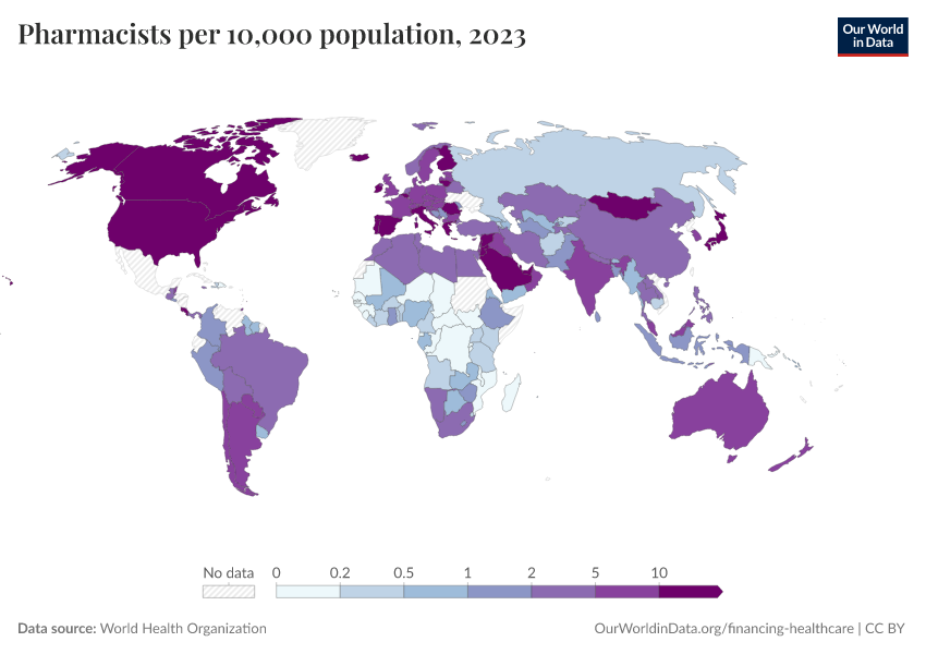 “Data Page: Pharmacists per 10,000 population”. Our World in Data (2026). Data adapted from World Health Organization. Retrieved from https://region-dods-income-groups.owid.pages.dev/grapher/pharmaceutical-personnel-per-1000 [online resource]How to cite this data