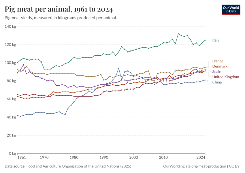 Food and Agriculture Organization of the United Nations (2025) – with major processing by Our World in Data. “Pig meat yield per animal – UN FAO” [dataset]. Food and Agriculture Organization of the United Nations, “Production: Crops and livestock products” [original data]. Retrieved February 26, 2026 from https://region-dods-income-groups.owid.pages.dev/grapher/pig-yields-meat-per-animal-in-hectograms-100-grams