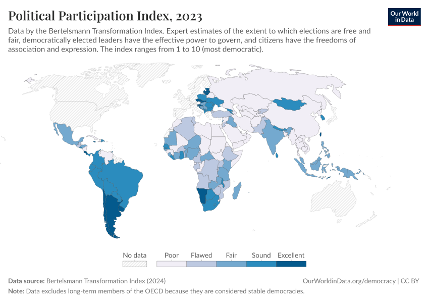 “Data Page: Political Participation Index”, part of the following publication: Bastian Herre, Lucas Rodés-Guirao, and Esteban Ortiz-Ospina (2013) - “Democracy”. Data adapted from Bertelsmann Transformation Index. Retrieved from https://region-dods-income-groups.owid.pages.dev/grapher/political-participation-index-bti [online resource]How to cite this data